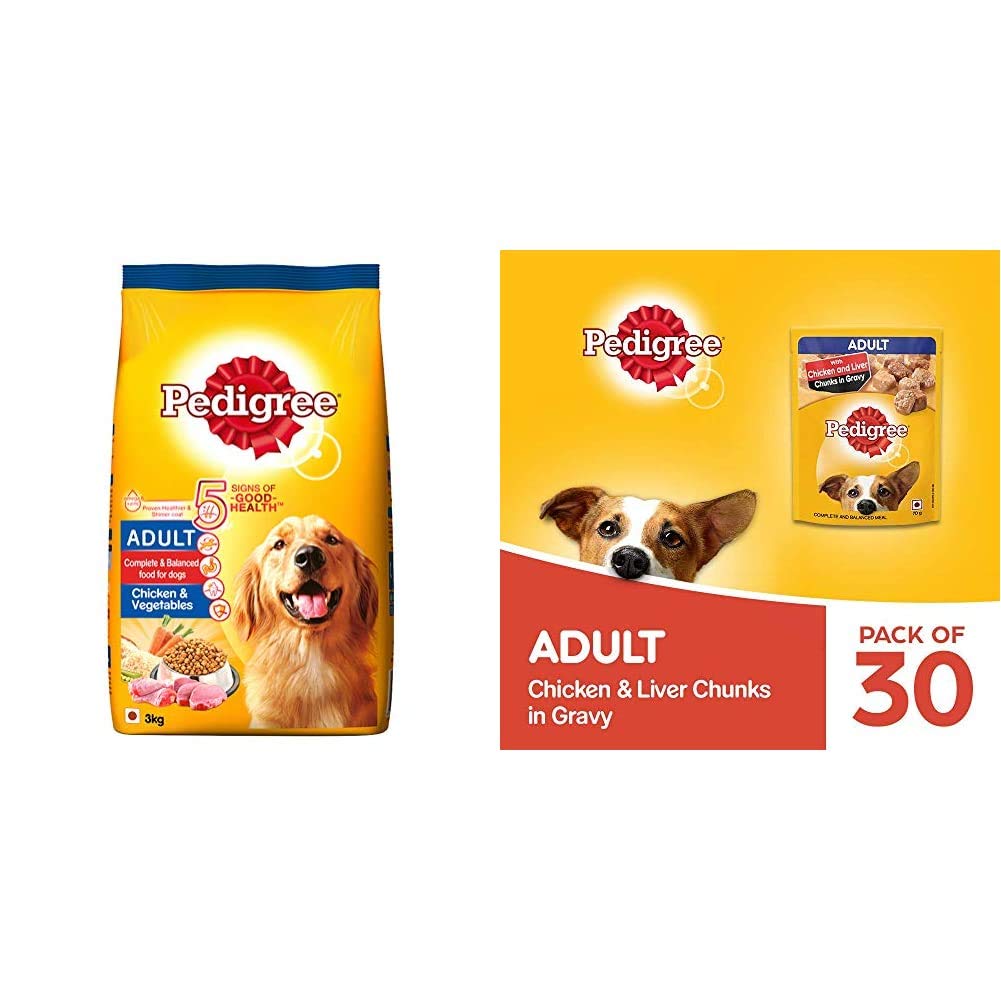 Pedigree Adult Dry Dog Food, Chicken & Vegetables, 3kg Pack & Pedigree Adult Wet Dog Food, Chicken & Liver Chunks in Gravy, 70 g (Pack of 30)