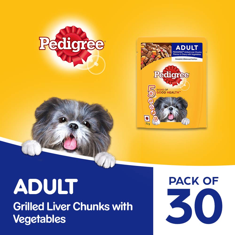 Pedigree Adult Wet Dog Food, Grilled Liver Chunks Flavour in Gravy with Vegetables, 30 Pouches ( 30 X 70 g )